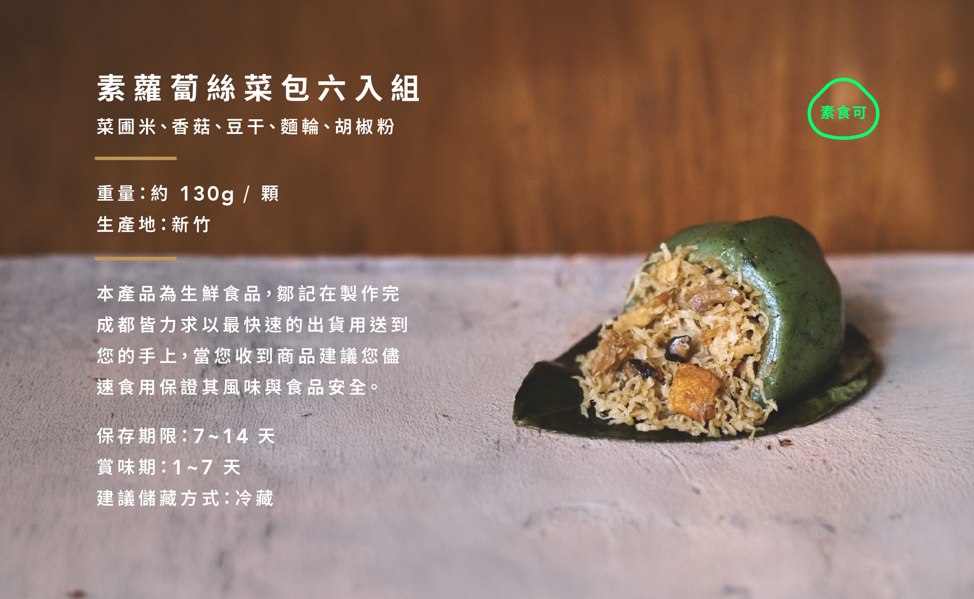 素蘿蔔絲菜包: 菜圃米、香菇、豆干、麵輪、胡椒粉
